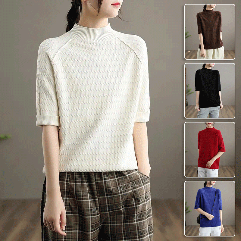 復古文藝半高領中袖針織衫,寬鬆顯瘦套頭半袖打底衫,不縮水不起球