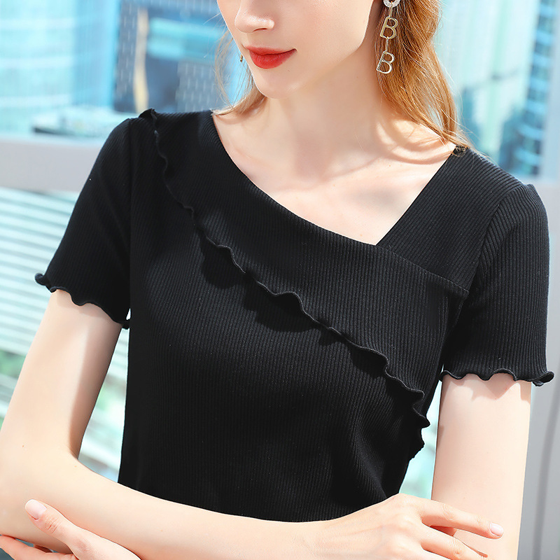 韓版時尚斜V領T恤,新款夏季霧霾藍木耳邊顯瘦短袖上衣,清涼透氣,面料舒適,美翻了