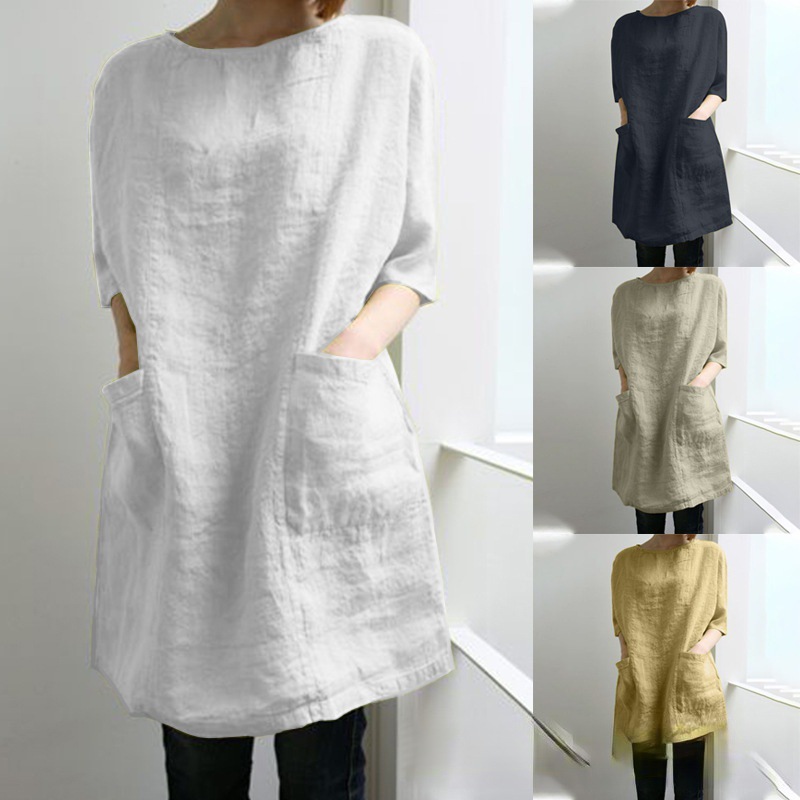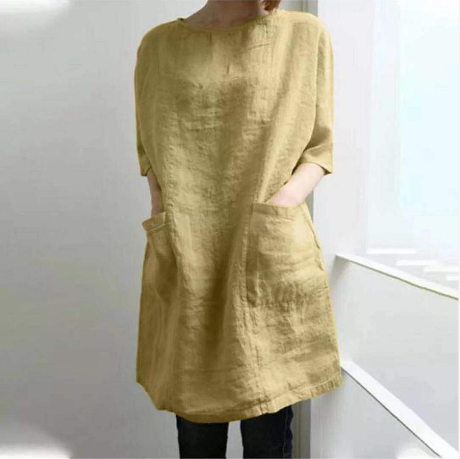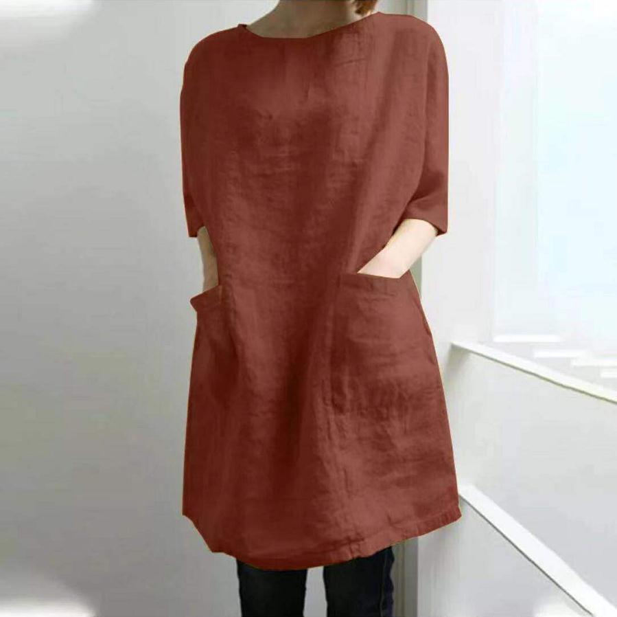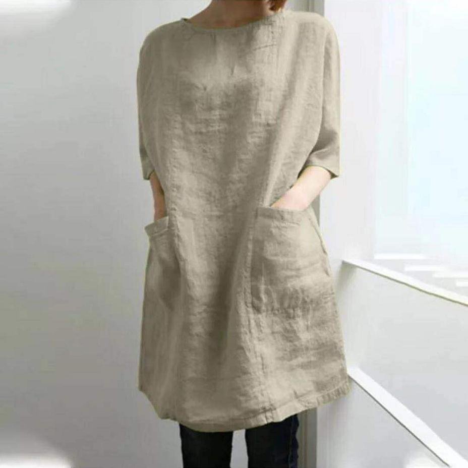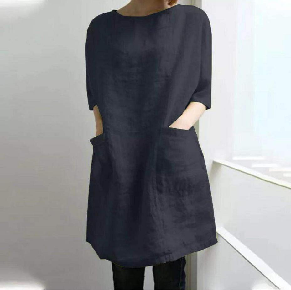 日系新款純色棉麻圓領口袋中袖連衣裙,拒絕悶熱超舒適,夏天穿更清涼